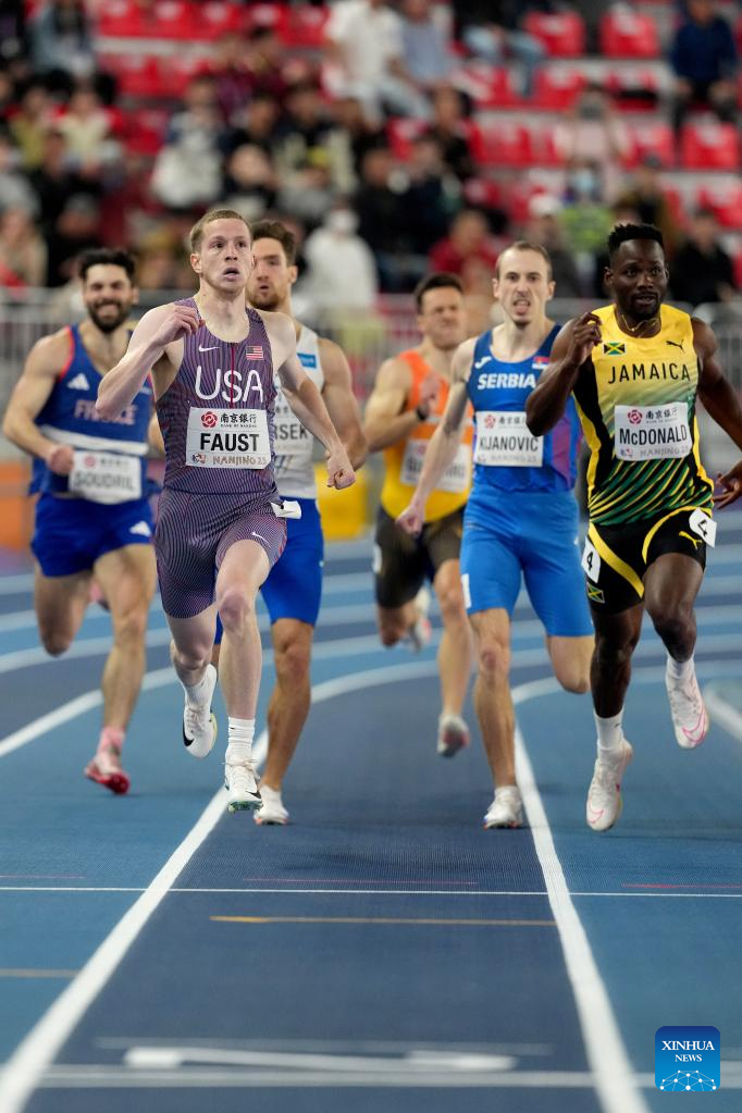Brian Faust (front L) of the United States competes during the men's 400m heats during the 2025 World Athletics Indoor Championships in Nanjing, east China's Jiangsu Province, March 21, 2025. (Xinhua/Yang Lei)