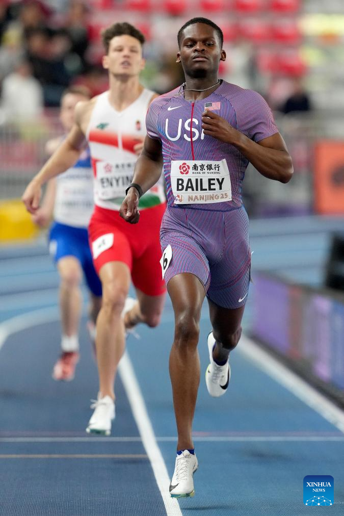 Christopher Bailey (front) of the United States competes during the men's 400m heats during the 2025 World Athletics Indoor Championships in Nanjing, east China's Jiangsu Province, March 21, 2025. (Xinhua/Yang Lei)