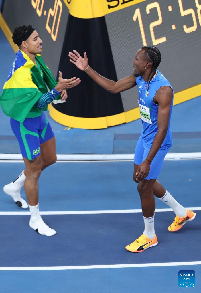 Andy Diaz Hernandez (R) of Italy greets with Almir Dos Santos of Brazil after the men's triple jump final at the 2025 World Athletics Indoor Championships in Nanjing, east China's Jiangsu Province, March 21, 2025. (Xinhua/Li Ming)