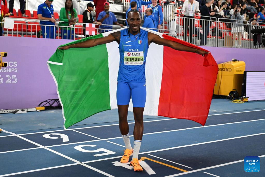 Andy Diaz Hernandez of Italy celebrates after the men's triple jump final at the 2025 World Athletics Indoor Championships in Nanjing, east China's Jiangsu Province, March 21, 2025. (Xinhua/Song Yanhua)
