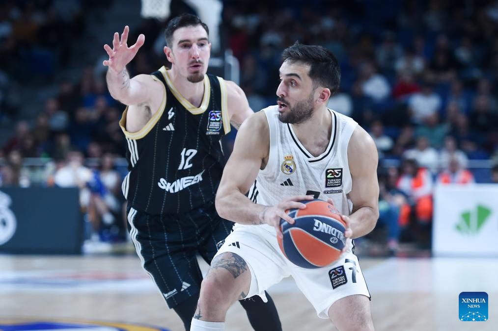 Mario Hezonja (front) of Real Madrid celebrates scoring during the EuroLeague basketball match between Real Madrid and LDLC Asvel Villeurbanne in Madrid, Spain, on March 20, 2025. (Photo by Gustavo Valiente/Xinhua)