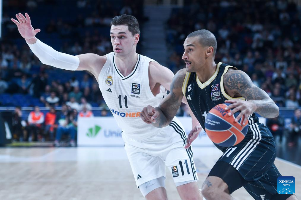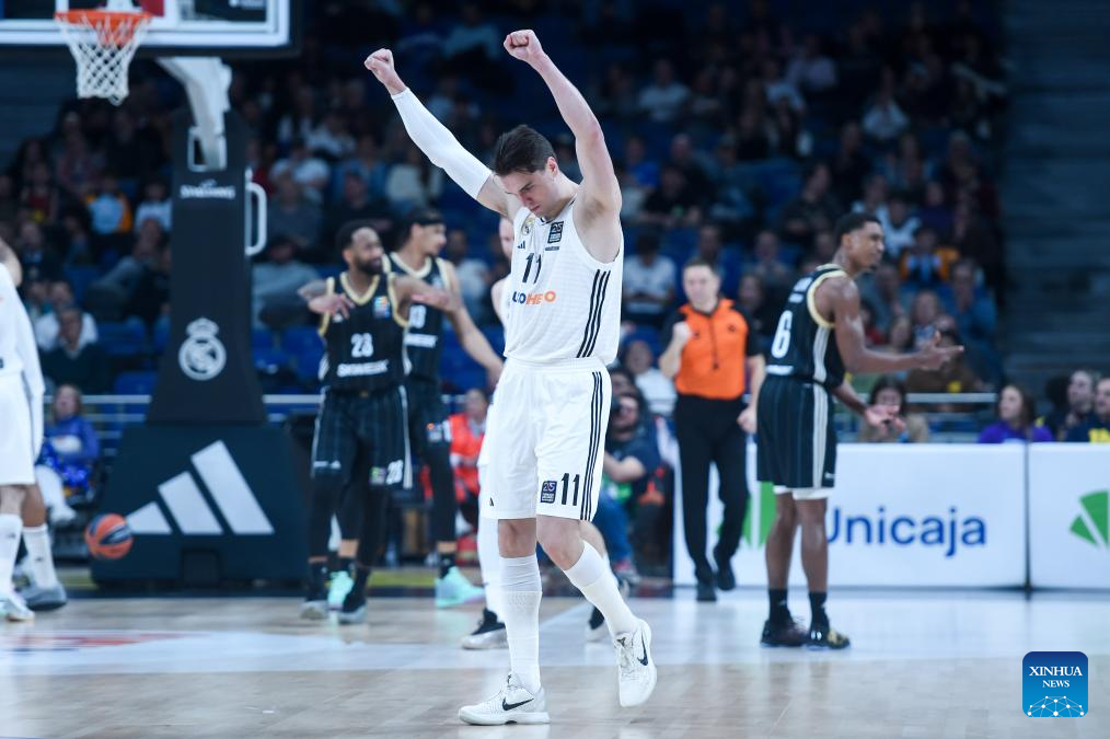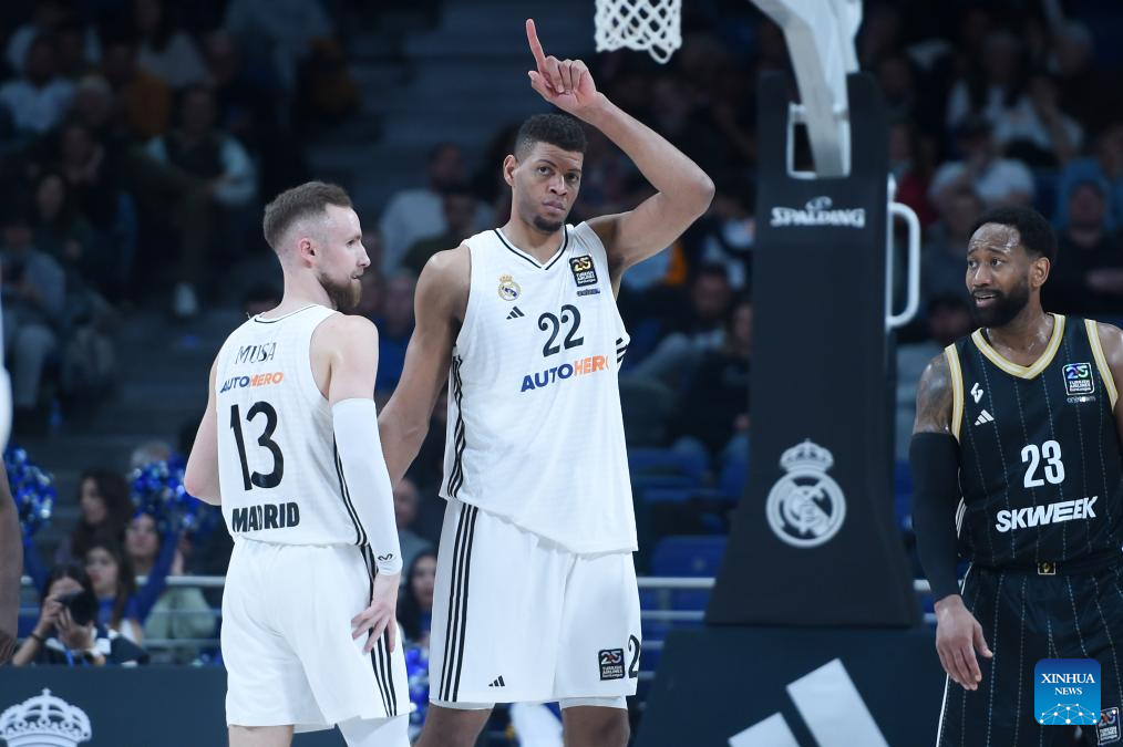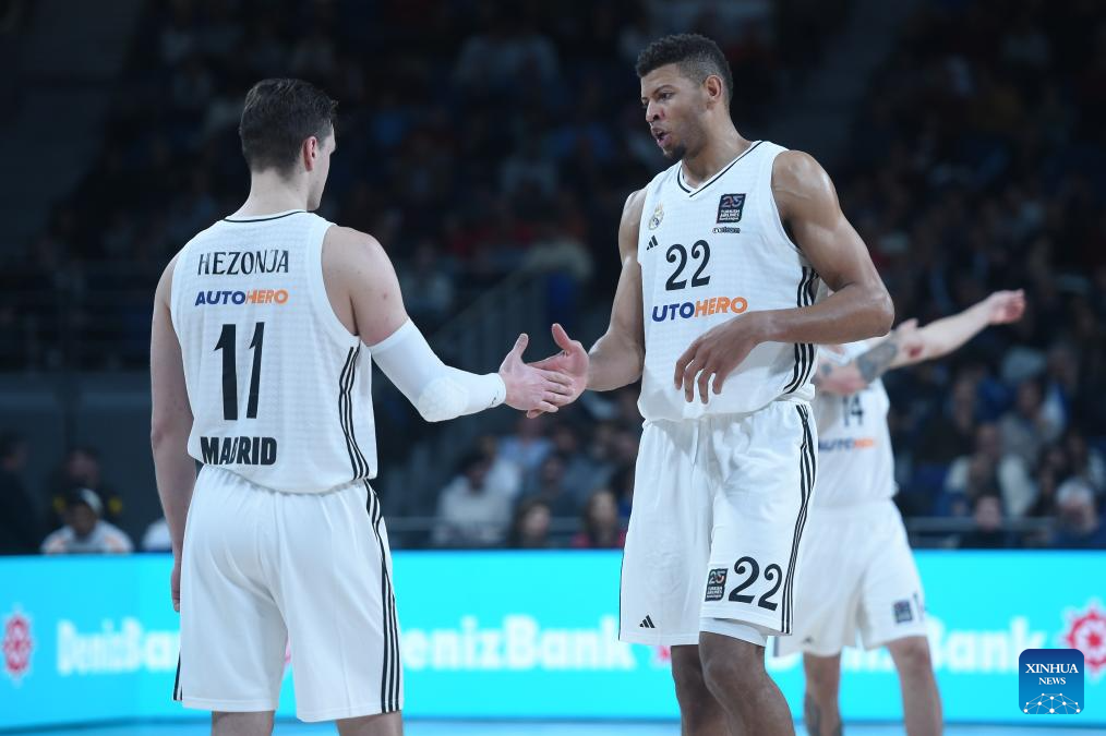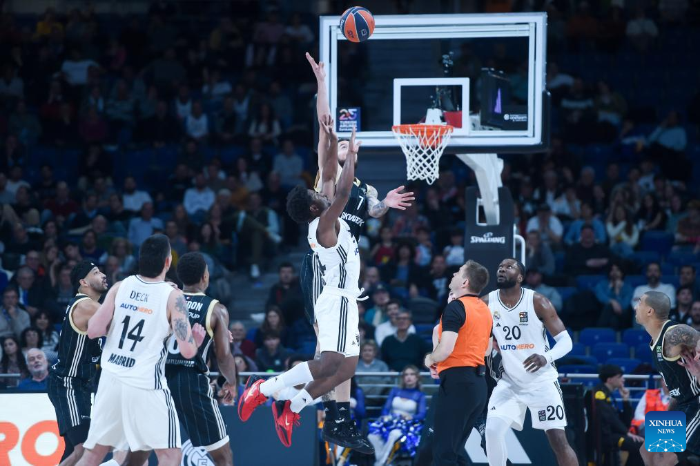 Walter Tavares (C) of Real Madrid celebrates scoring during the EuroLeague basketball match between Real Madrid and LDLC Asvel Villeurbanne in Madrid, Spain, on March 20, 2025. (Photo by Gustavo Valiente/Xinhua)