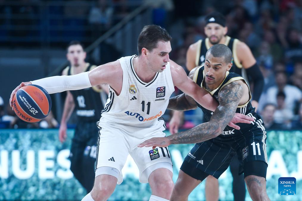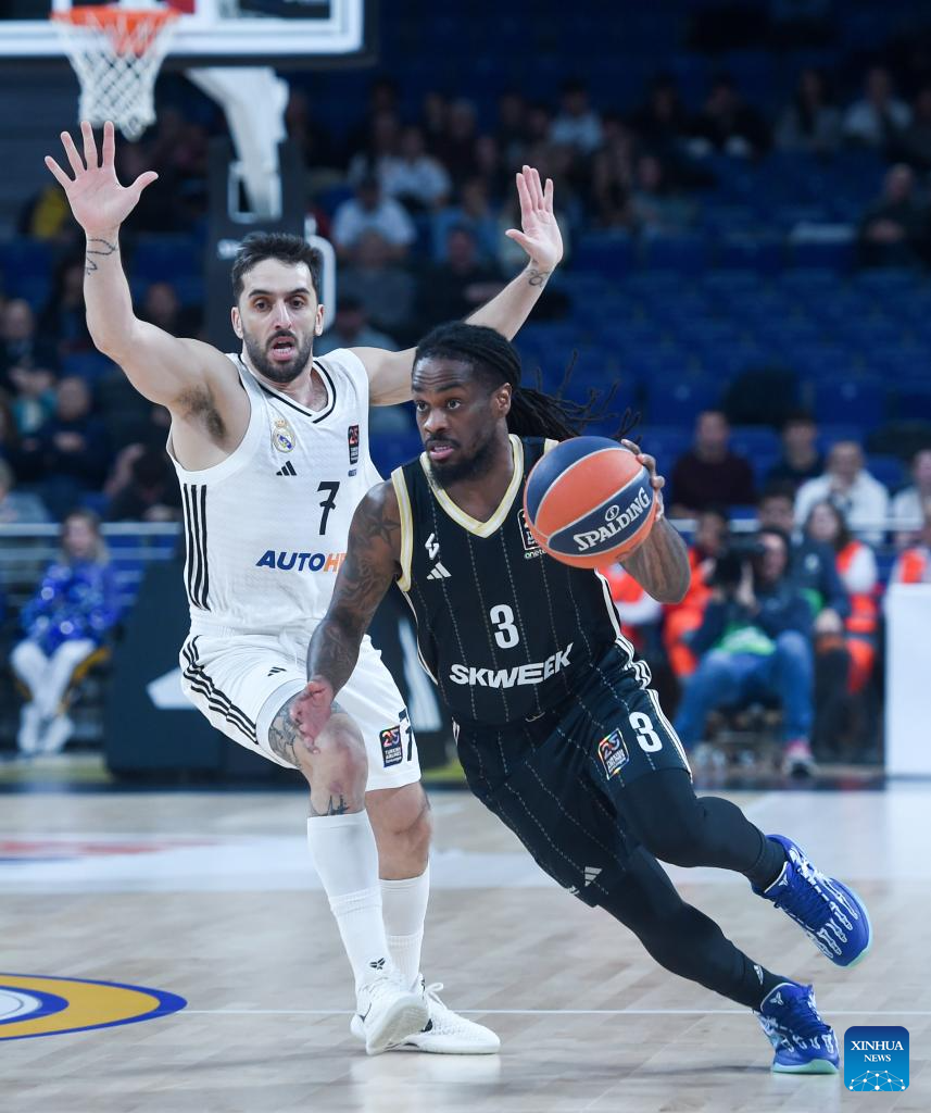 Mario Hezonja (L) of Real Madrid defends Edwin Jackson of LDLC Asvel Villeurbanne during the EuroLeague basketball match between Real Madrid and LDLC Asvel Villeurbanne in Madrid, Spain, on March 20, 2025. (Photo by Gustavo Valiente/Xinhua)
