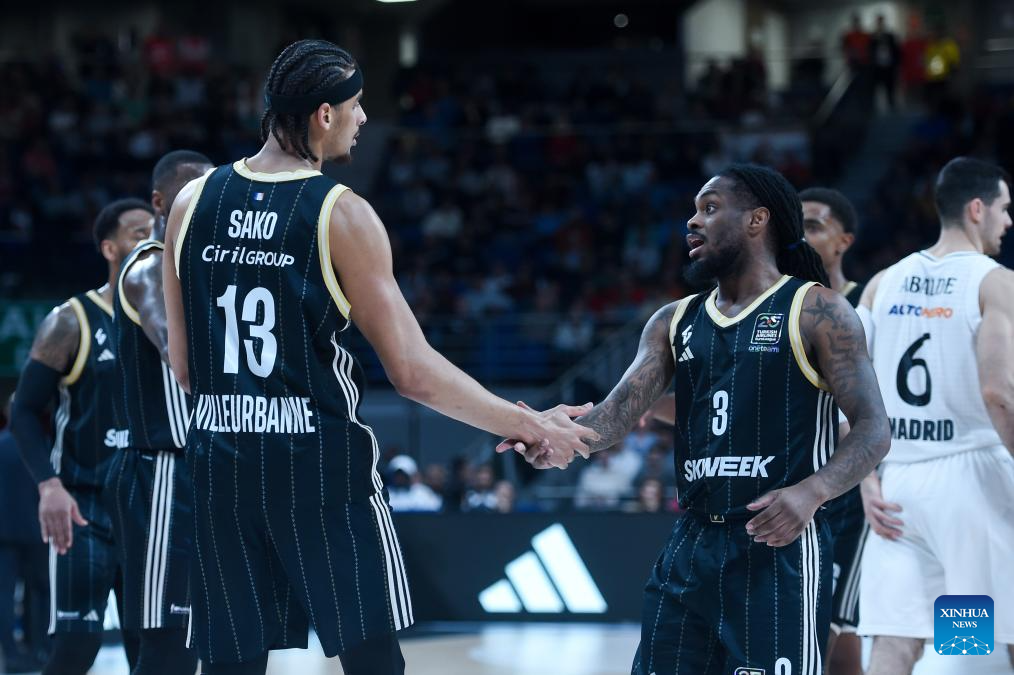 Neal Sako (L) and Paris Lee of LDLC Asvel Villeurbanne celebrate scoring during the EuroLeague basketball match between Real Madrid and LDLC Asvel Villeurbanne in Madrid, Spain, on March 20, 2025. (Photo by Gustavo Valiente/Xinhua)