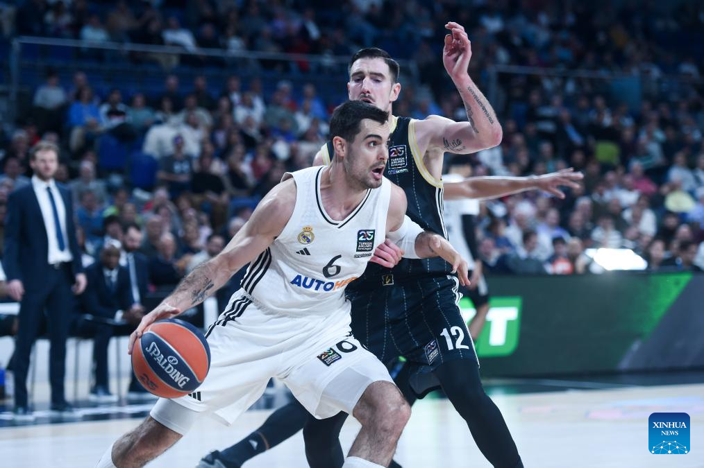 Alberto Abalde (front) of Real Madrid breaks through past Nando de Colo of LDLC Asvel Villeurbanne during the EuroLeague basketball match between Real Madrid and LDLC Asvel Villeurbanne in Madrid, Spain, on March 20, 2025. (Photo by Gustavo Valiente/Xinhua)