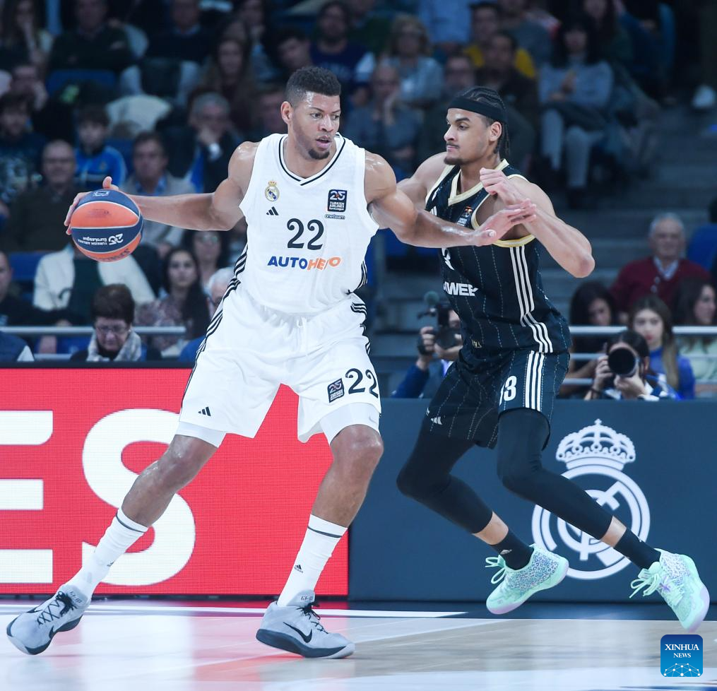 Walter Tavares (L) of Real Madrid breaks through past Neal Sako of LDLC Asvel Villeurbanne during the EuroLeague basketball match between Real Madrid and LDLC Asvel Villeurbanne in Madrid, Spain, on March 20, 2025. (Photo by Gustavo Valiente/Xinhua)