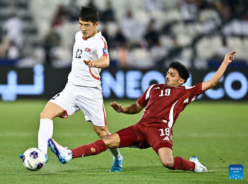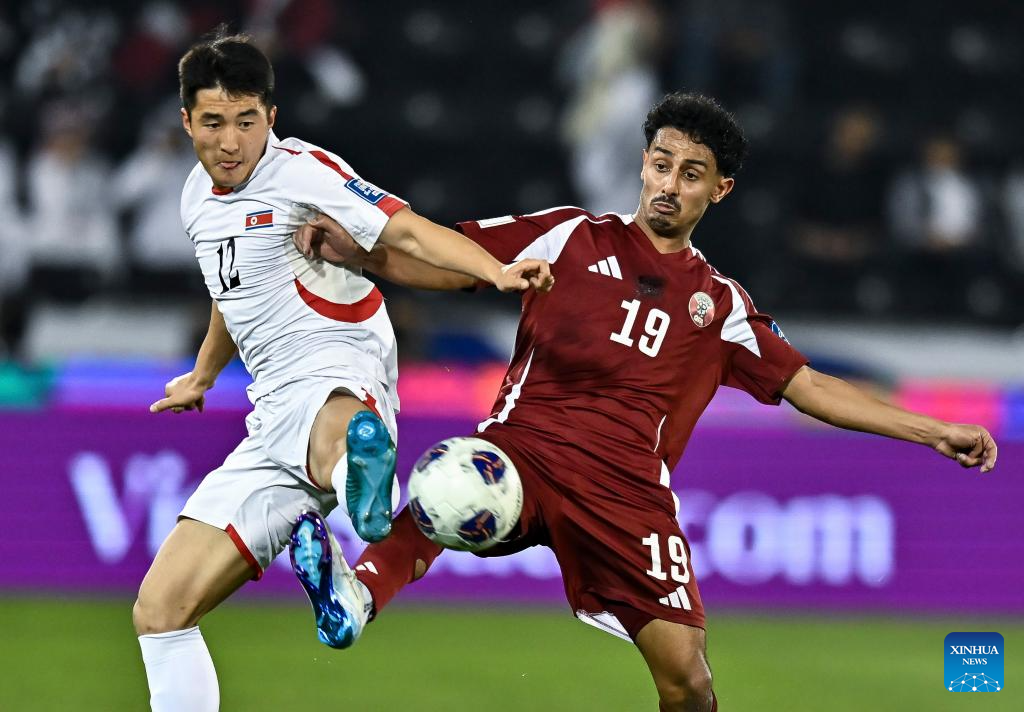 Ahmed Alganehi (R) of Qatar vies with Choe Ryong Il of DPRK during the 2026 FIFA World Cup Asian Qualifier match between Qatar and the Democratic People's Republic of Korea (DPRK) at the Jassim bin Hamad Stadium in Doha, Qatar, on March 20, 2025. (Photo by Nikku/Xinhua)