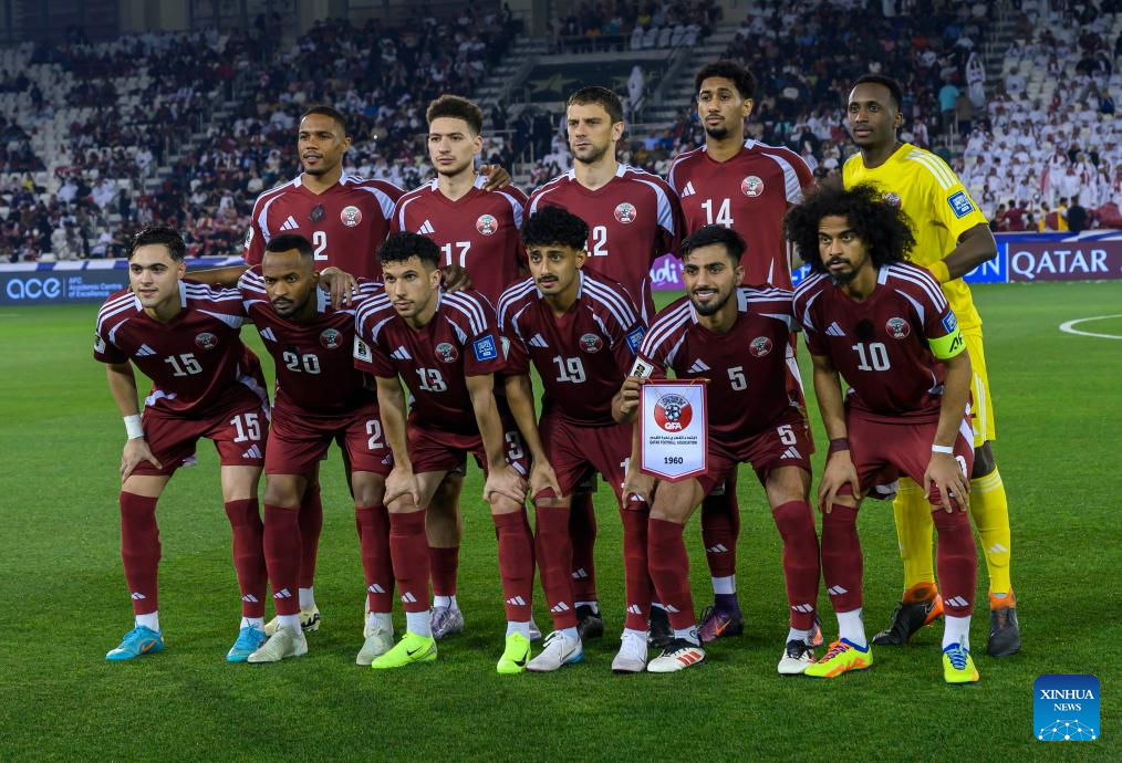 Players of Qatar pose for photos before the 2026 FIFA World Cup Asian Qualifier match between Qatar and the Democratic People's Republic of Korea (DPRK) at the Jassim bin Hamad Stadium in Doha, Qatar, on March 20, 2025. (Photo by Nikku/Xinhua)