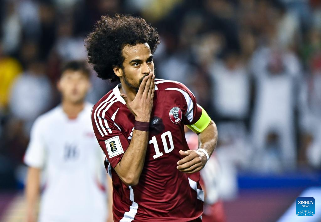 Akram Afif of Qatar celebrates his goal during the 2026 FIFA World Cup Asian Qualifier match between Qatar and the Democratic People's Republic of Korea (DPRK) at the Jassim bin Hamad Stadium in Doha, Qatar, on March 20, 2025. (Photo by Nikku/Xinhua)