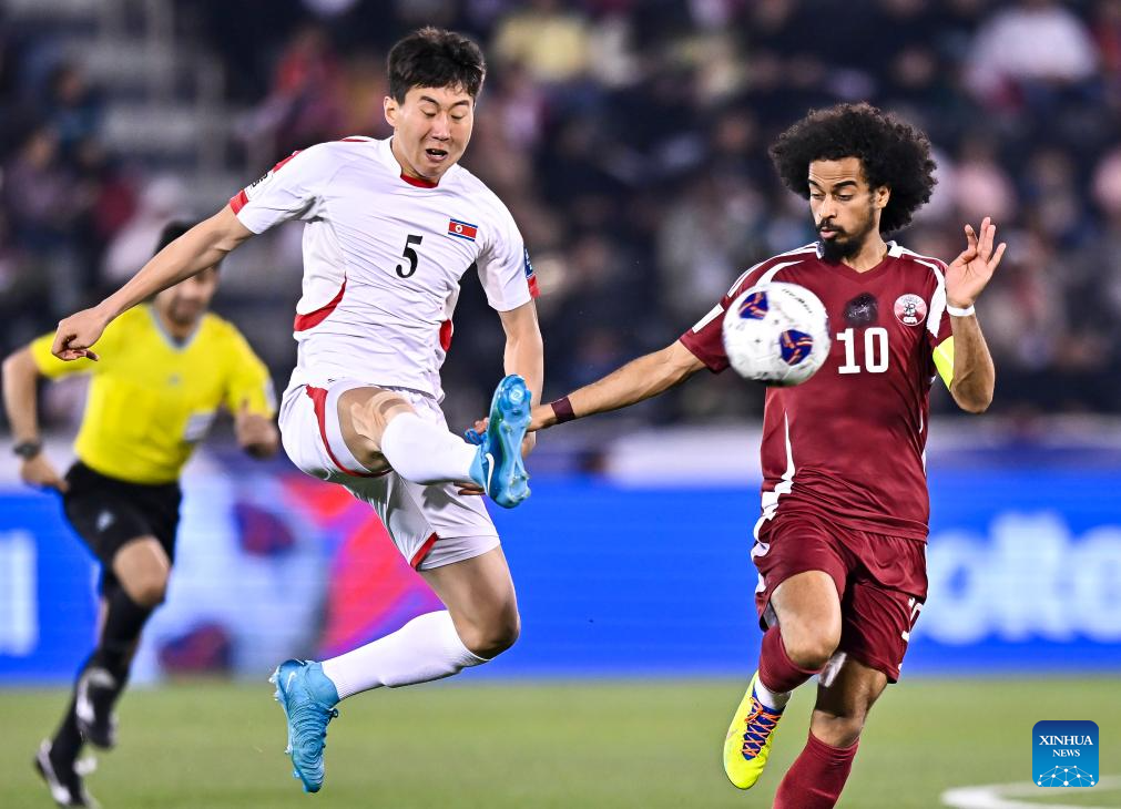 Akram Afif (R) of Qatar vies with Jong Hwi Nam of DPRK during the 2026 FIFA World Cup Asian Qualifier match between Qatar and the Democratic People's Republic of Korea (DPRK) at the Jassim bin Hamad Stadium in Doha, Qatar, on March 20, 2025. (Photo by Nikku/Xinhua)
