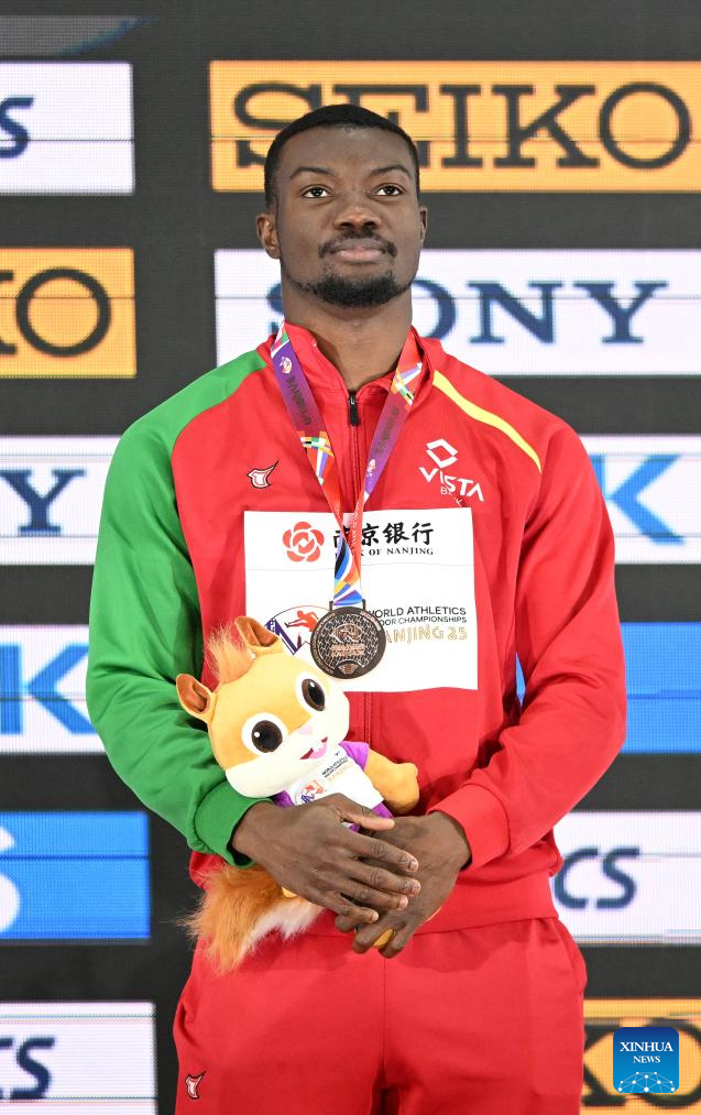 Hugues Fabrice Zango of Burkina Faso reacts during the awarding ceremony of men's triple jump at the 2025 World Athletics Indoor Championships in Nanjing, east China's Jiangsu Province, March 21, 2025. (Xinhua/Song Yanhua)