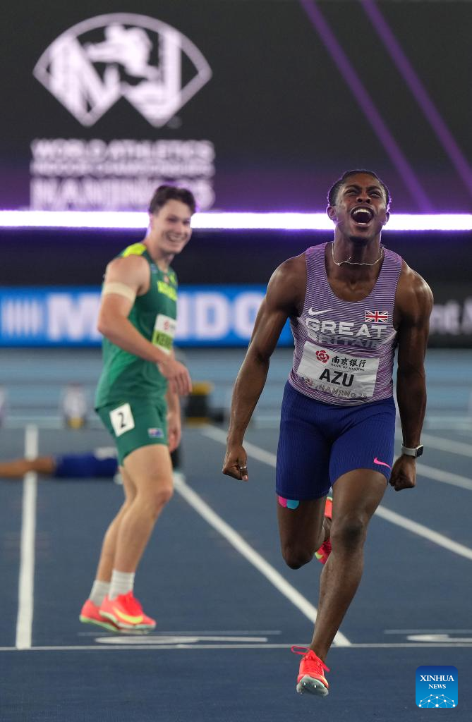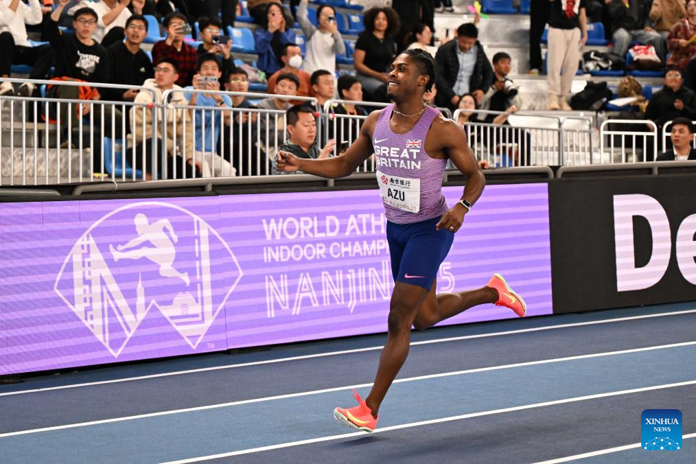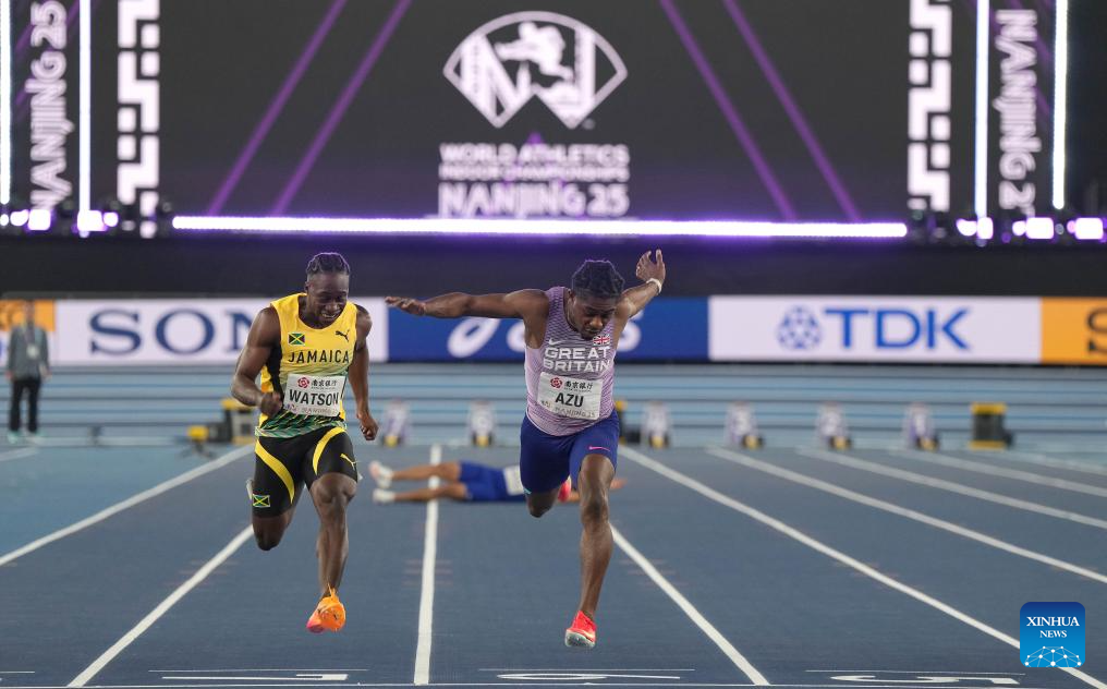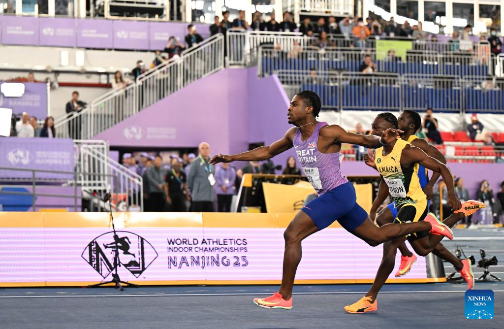 Jeremiah Azu (R) of Britain competes during the men's 60m final at the 2025 World Athletics Indoor Championships in Nanjing, east China's Jiangsu Province, March 21, 2025. (Xinhua/Li Bo)