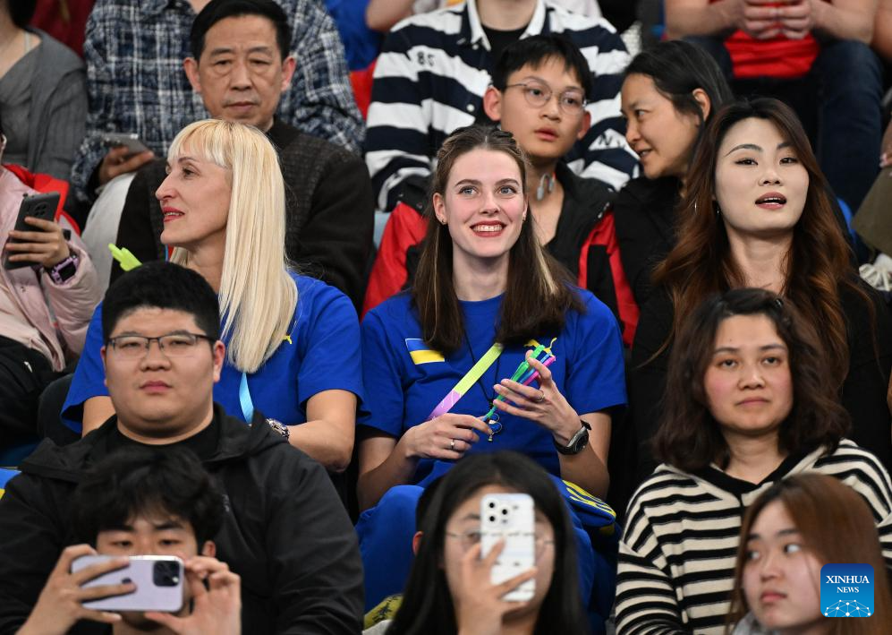 Yaroslava Mahuchikh (C) of Ukraine is seen in tribune during the men's high jump final at the 2025 World Athletics Indoor Championships in Nanjing, east China's Jiangsu Province, March 21, 2025. (Xinhua/Song Yanhua)