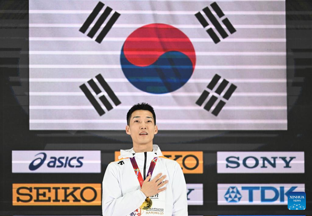Woo Sanghyeok of South Korea reacts during the awarding ceremony of men's high jump at the 2025 World Athletics Indoor Championships in Nanjing, east China's Jiangsu Province, March 21, 2025. (Xinhua/Song Yanhua)