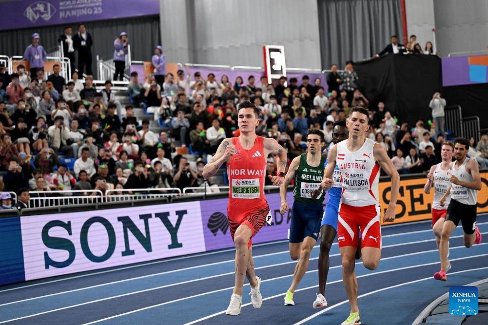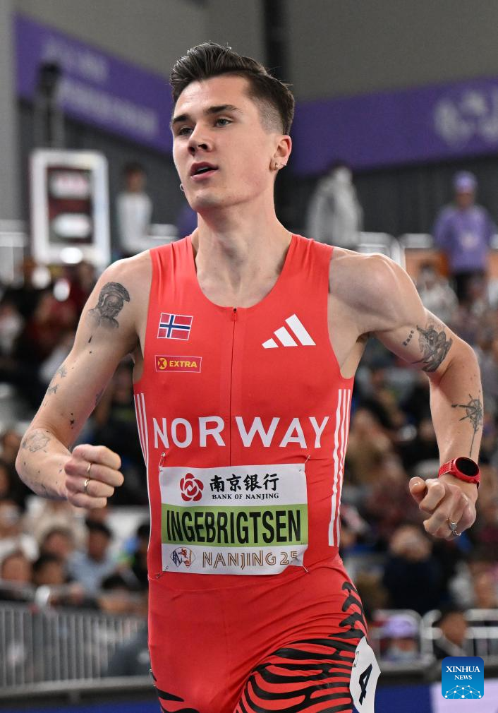 Jakob Ingebrigtsen of Norway competes during the men's 1500m round 1 at the 2025 World Athletics Indoor Championships in Nanjing, east China's Jiangsu Province, March 21, 2025. (Xinhua/Song Yanhua)