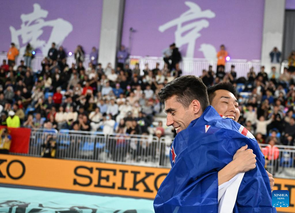 Woo Sanghyeok (R) of South Korea hugs with Hamish Kerr of New Zealand after the men's high jump final at the 2025 World Athletics Indoor Championships in Nanjing, east China's Jiangsu Province, March 21, 2025. (Xinhua/Song Yanhua)