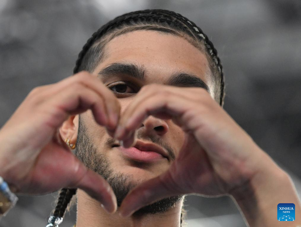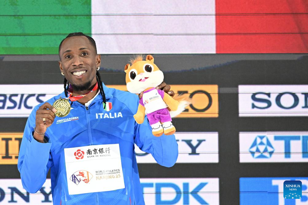 Andy Diaz Hernandez of Italy reacts during the awarding ceremony of men's triple jump at the 2025 World Athletics Indoor Championships in Nanjing, east China's Jiangsu Province, March 21, 2025. (Xinhua/Song Yanhua)