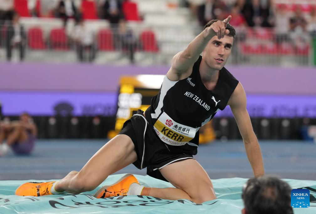 Hamish Kerr of New Zealand reacts during the men's high jump final at the 2025 World Athletics Indoor Championships in Nanjing, east China's Jiangsu Province, March 21, 2025. (Xinhua/Song Yanhua)