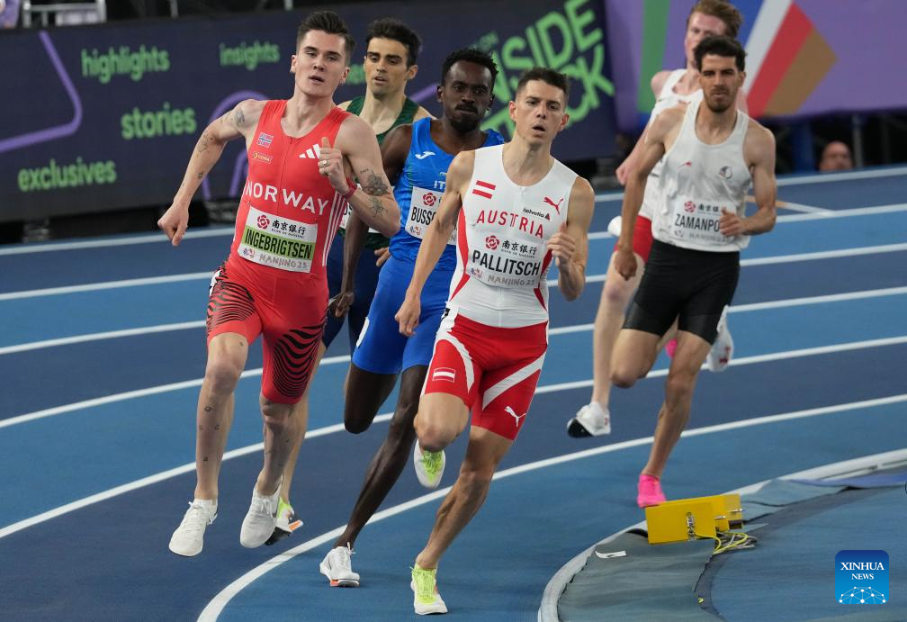 Jakob Ingebrigtsen (1st L) of Norway competes during the men's 1500m round 1 at the 2025 World Athletics Indoor Championships in Nanjing, east China's Jiangsu Province, March 21, 2025. (Xinhua/Yang Lei)