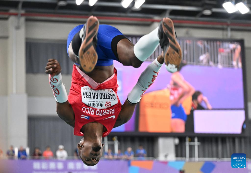 Luis Castro Rivera of Puerto Rico jumps up during the men's high jump final at the 2025 World Athletics Indoor Championships in Nanjing, east China's Jiangsu Province, March 21, 2025. (Xinhua/Song Yanhua)