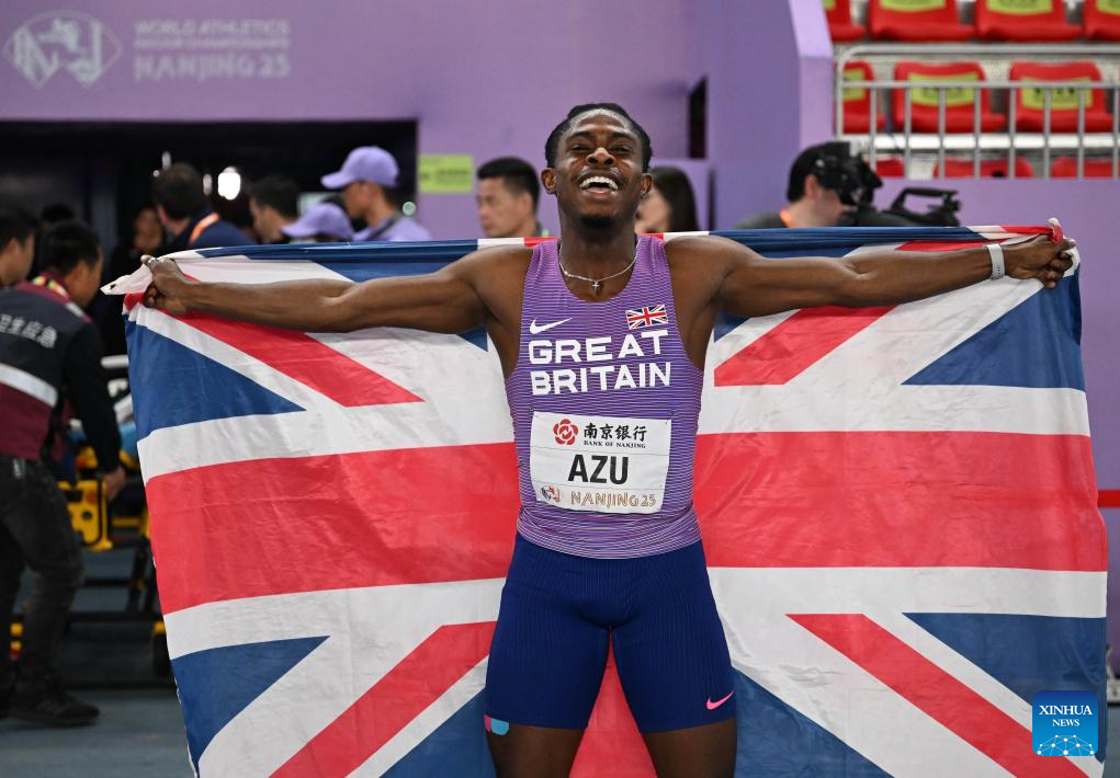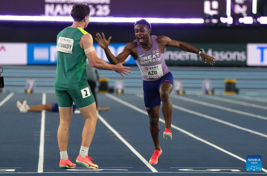 Jeremiah Azu (R) of Britain celebrates after the men's 60m final at the 2025 World Athletics Indoor Championships in Nanjing, east China's Jiangsu Province, March 21, 2025. (Xinhua/Li Bo)