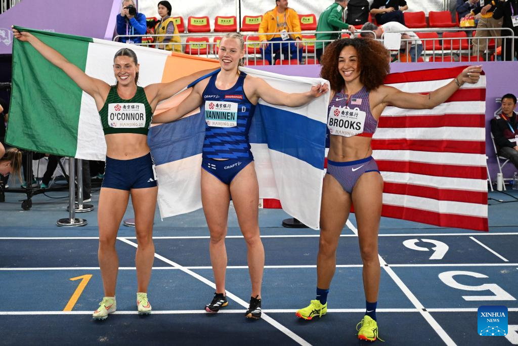 (L-R) Kate O'Connor of Ireland, Saga Vanninen of Finland and Taliyah Brooks of the United States pose for photos during the awarding ceremony of women's pentathlon at the 2025 World Athletics Indoor Championships in Nanjing, east China's Jiangsu Province, March 21, 2025. (Xinhua/Song Yanhua)