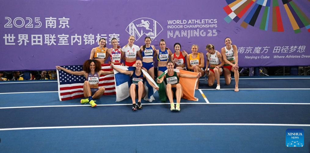 Athletes pose for group photo after the women's pentathlon at the 2025 World Athletics Indoor Championships in Nanjing, east China's Jiangsu Province, March 21, 2025. (Xinhua/Song Yanhua)