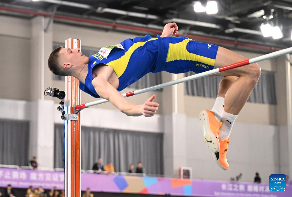 Oleh Doroshchuk of Ukraine competes during the men's high jump final at the 2025 World Athletics Indoor Championships in Nanjing, east China's Jiangsu Province, March 21, 2025. (Xinhua/Song Yanhua)