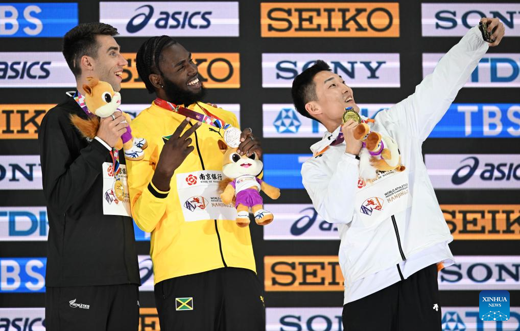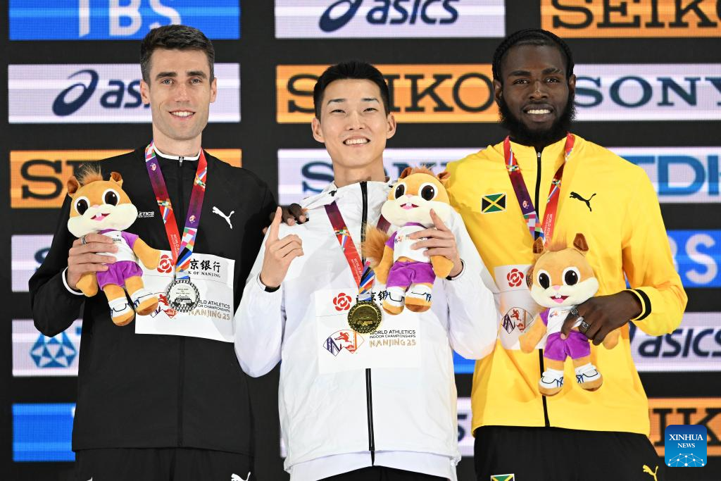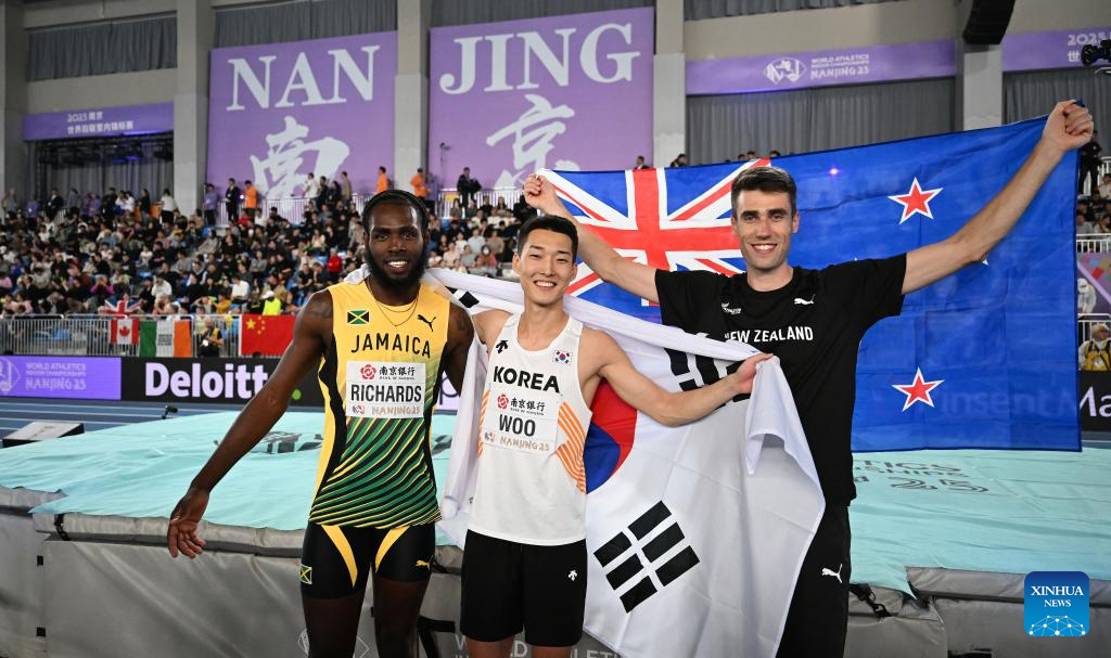 (L-R) Hamish Kerr of New Zealand, Woo Sanghyeok of South Korea and Raymond Richards of Jamaica pose for photos during the awarding ceremony of men's high jump at the 2025 World Athletics Indoor Championships in Nanjing, east China's Jiangsu Province, March 21, 2025. (Xinhua/Song Yanhua)