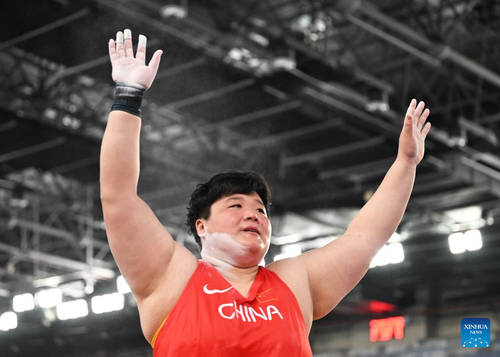 Gong Lijiao of China greets spectators after her last attempt during the women's shot put final at the 2025 World Athletics Indoor Championships in Nanjing, east China's Jiangsu Province, March 21, 2025. (Xinhua/Song Yanhua)