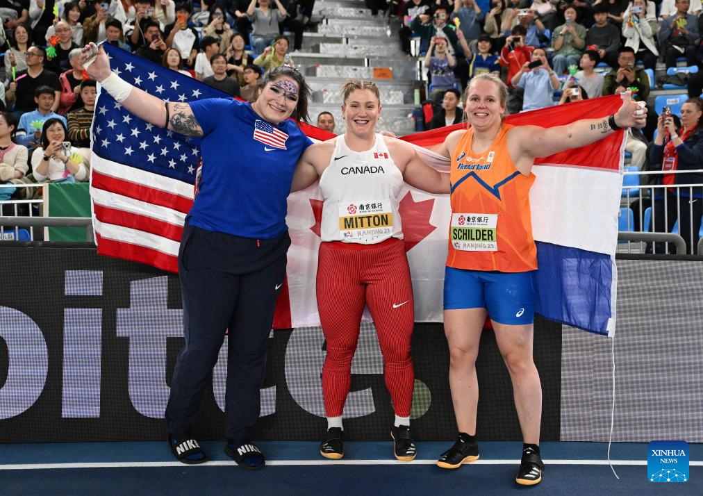 (L-R) Chase Jackson of the United States, Sarah Mitton of Canada and Jessica Schilder of the Netherlands celebrate after the women's shot put final at the 2025 World Athletics Indoor Championships in Nanjing, east China's Jiangsu Province, March 21, 2025. (Xinhua/Song Yanhua)