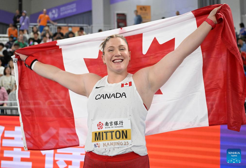 Sarah Mitton of Canada celebrates after the women's shot put final at the 2025 World Athletics Indoor Championships in Nanjing, east China's Jiangsu Province, March 21, 2025. (Xinhua/Song Yanhua)
