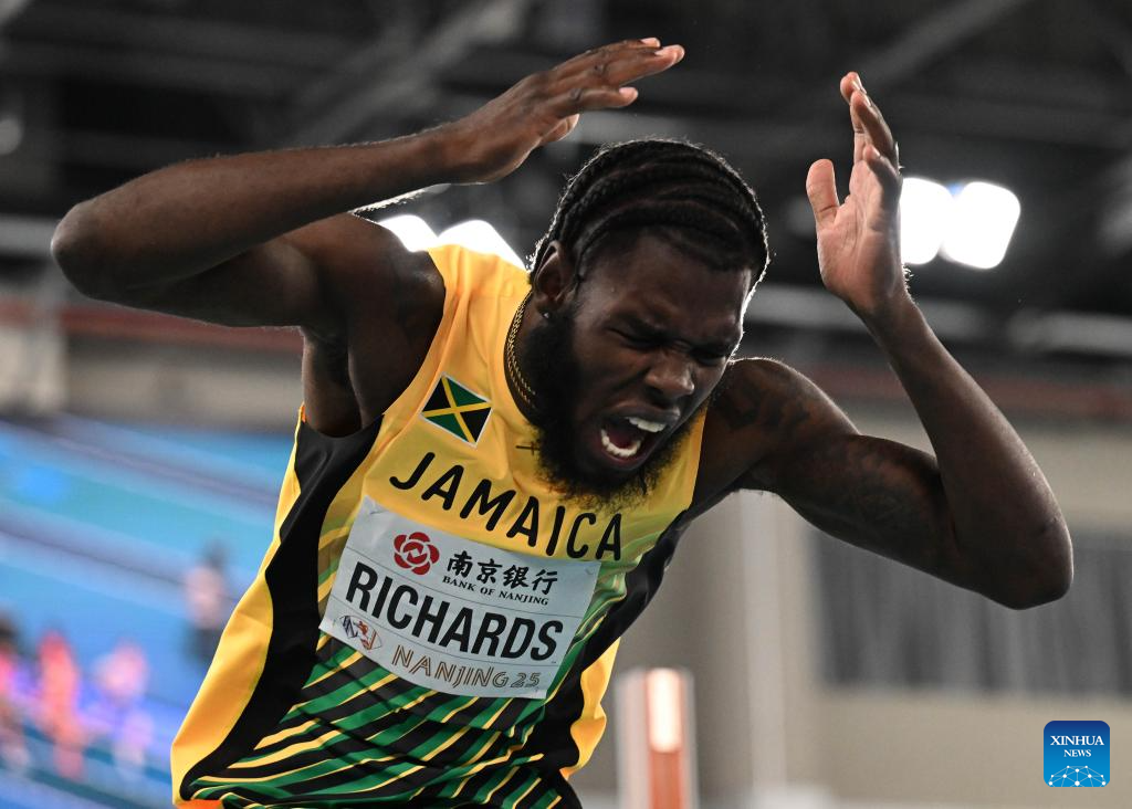 Raymond Richards of Jamaica reacts during the men's high jump final at the 2025 World Athletics Indoor Championships in Nanjing, east China's Jiangsu Province, March 21, 2025. (Xinhua/Song Yanhua)