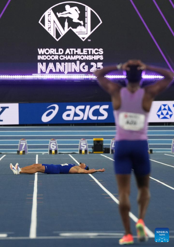 Eloy Benitez of Puerto Rico reacts after falling during the men's 60m final at the 2025 World Athletics Indoor Championships in Nanjing, east China's Jiangsu Province, March 21, 2025. (Xinhua/Li Bo)