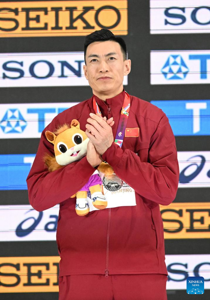Zhu Yaming of China reacts during the awarding ceremony of men's triple jump at the 2025 World Athletics Indoor Championships in Nanjing, east China's Jiangsu Province, March 21, 2025. (Xinhua/Song Yanhua)
