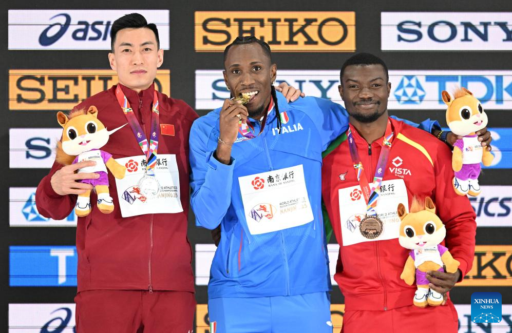 (L-R) Zhu Yaming of China, Andy Diaz Hernandez of Italy and Hugues Fabrice Zango of Burkina Faso pose for group photo during the awarding ceremony of men's triple jump at the 2025 World Athletics Indoor Championships in Nanjing, east China's Jiangsu Province, March 21, 2025. (Xinhua/Song Yanhua)