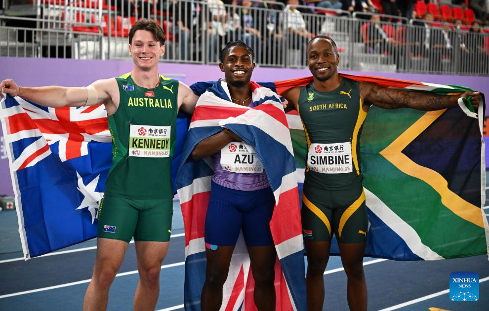 (L-R) Lachlan Kennedy of Australia, Jeremiah Azu of Britain and Akani Simbine of South Africa celebrate after the men's 60m final at the 2025 World Athletics Indoor Championships in Nanjing, east China's Jiangsu Province, March 21, 2025. (Xinhua/Li Bo)