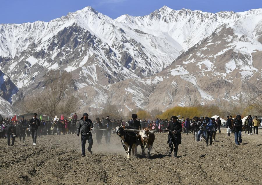 Villagers demonstrate a traditional plowing method in Taxkorgan Tajik Autonomous County, northwest China's Xinjiang Uygur Autonomous Region, March 22, 2025. (Xinhua/Hu Huhu)
