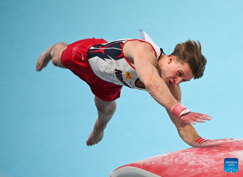 Yahor Sharamkou of Belarus competes during the men's vault final at the FIG Artistic Gymnastics Apparatus World Cup 2025 in Antalya, Türkiye, March 23, 2025. (Xinhua/Liu Lei)