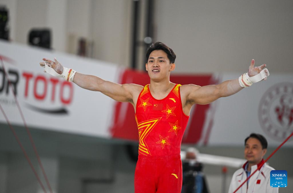 Liao Jialei of China greets the spectators during the men's horizontal bar final at the FIG Artistic Gymnastics Apparatus World Cup 2025 in Antalya, Türkiye, March 23, 2025. (Xinhua/Liu Lei)