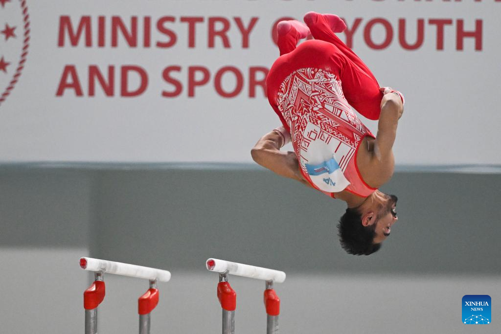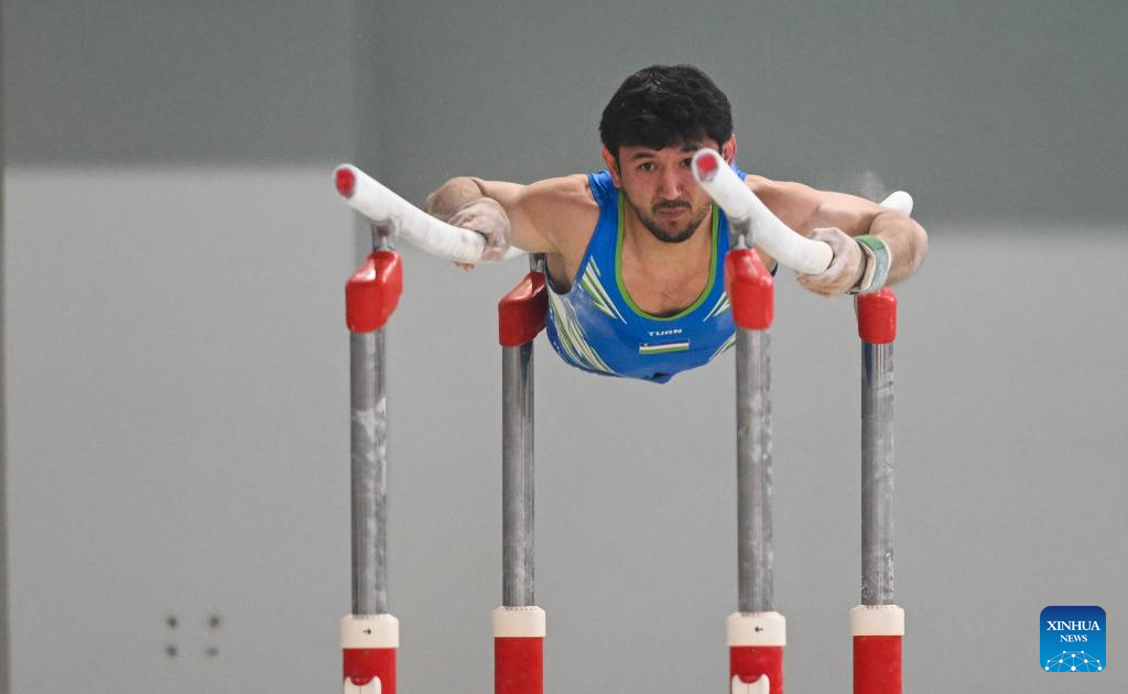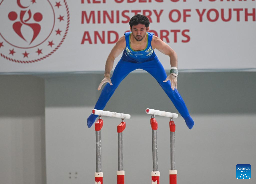 Rasuljon Abdurakhimov of Uzbekistan competes during the men's parallel bars final at the FIG Artistic Gymnastics Apparatus World Cup 2025 in Antalya, Türkiye, March 23, 2025. (Xinhua/Liu Lei)