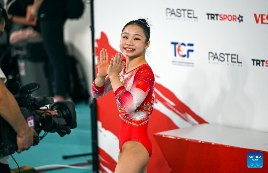 Tian Zhuofan of China greets the spectators after the women's balance beam final at the FIG Artistic Gymnastics Apparatus World Cup 2025 in Antalya, Türkiye, March 23, 2025. (Xinhua/Liu Lei)