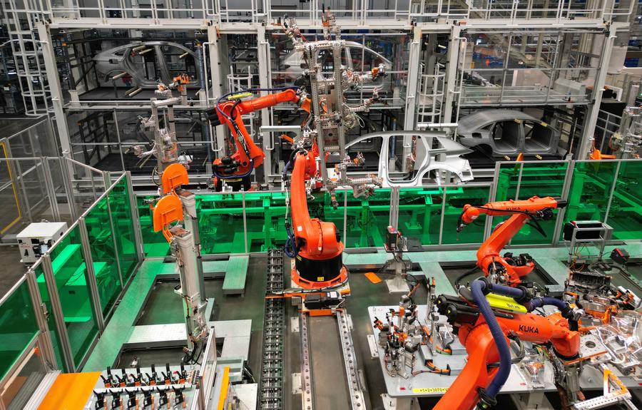 CHANGCHUN, March 25 (Xinhua) -- In the workshops of Audi's first dedicated electric vehicle production base in China, entire steel plates are swiftly transformed into components by press machines, while robotic arms operate with precision on the assembly line, primed to produce the new Audi Q6L e-tron.