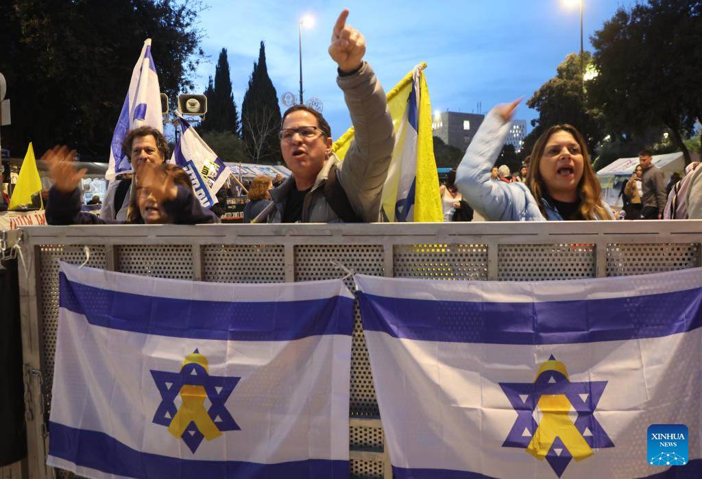 People demonstrate outside Israel's parliament, known as the Knesset, in Jerusalem, on March 25, 2025. Israel's parliament approved Tuesday the 2025 state budget, which amounts to 619 billion shekels (about 169 billion U.S. dollars) excluding debt-servicing, the Finance Ministry said in a statement.