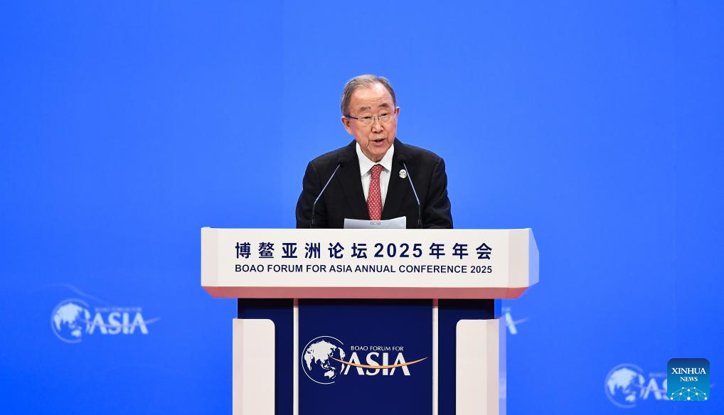 Ban Ki-moon, chairman of the Boao Forum for Asia (BFA) and former UN secretary-general, speaks at the opening ceremony of the BFA Annual Conference 2025 in Boao, south China's Hainan Province, March 27, 2025. (Xinhua/Yang Guanyu)