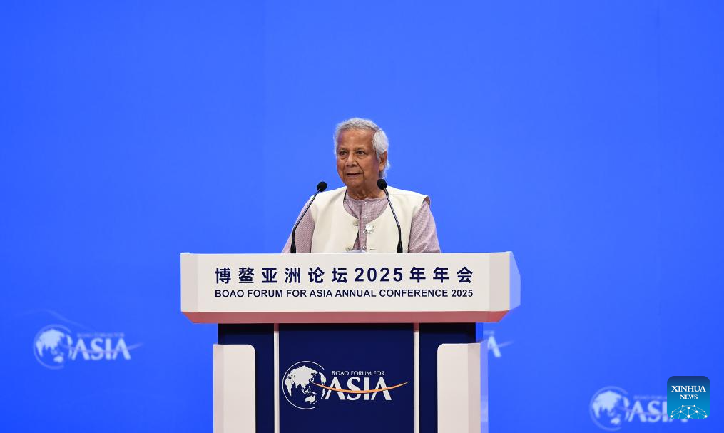 Bangladeshi interim government's Chief Adviser Muhammad Yunus speaks at the opening ceremony of the Boao Forum for Asia (BFA) Annual Conference 2025 in Boao, south China's Hainan Province, March 27, 2025. (Xinhua/Yang Guanyu)