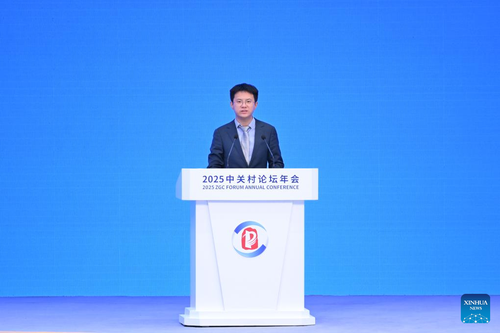 Wang He, founder and CTO of Beijing Galbot Co., Ltd., delivers a speech during a plenary session of the 2025 Zhongguancun Forum Annual Conference in Beijing, capital of China, March 27, 2025. (Xinhua/Li Xin)