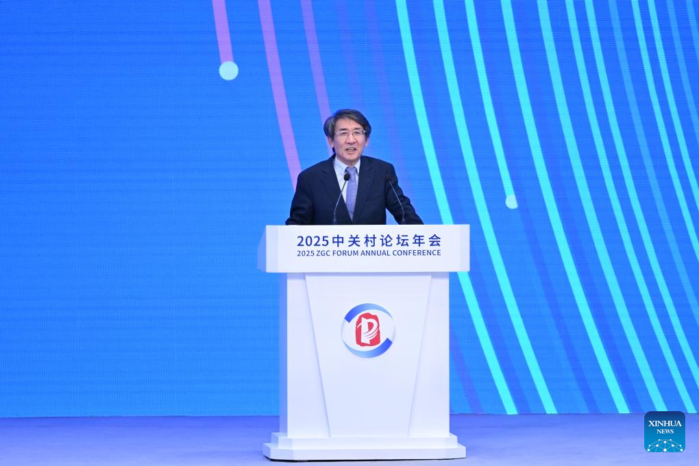 Chinese physicist Xue Qikun, winner of the country's top sci-tech award for the year 2023, delivers a speech during a plenary session of the 2025 Zhongguancun Forum Annual Conference in Beijing, capital of China, March 27, 2025. (Xinhua/Li Xin)