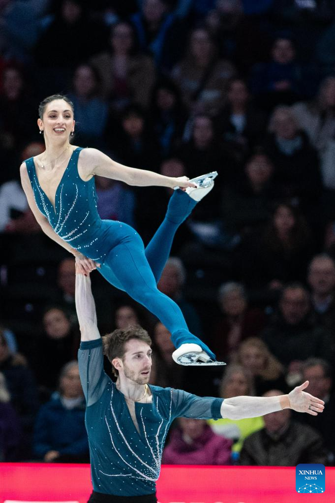Sara Conti (R)/Niccolo Macii of Italy compete during the pairs free skating at the ISU 2025 World Figure Skating Championships in Boston, the United States on March 27, 2025. (Photo by Ziyu Julian Zhu/Xinhua)