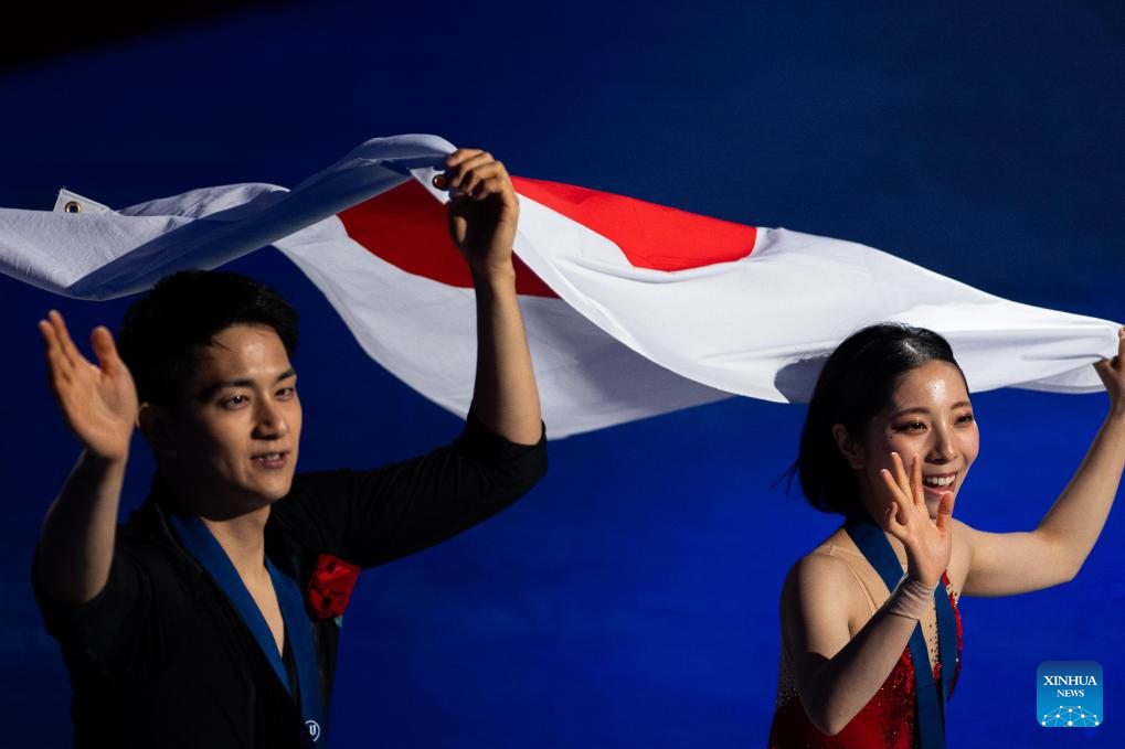 Gold medalists Miura Riku (R)/Kihara Ryuichi of Japan celebrate during the awarding ceremony for the pairs skating event at the ISU 2025 World Figure Skating Championships in Boston, the United States on March 27, 2025. (Photo by Ziyu Julian Zhu/Xinhua)
